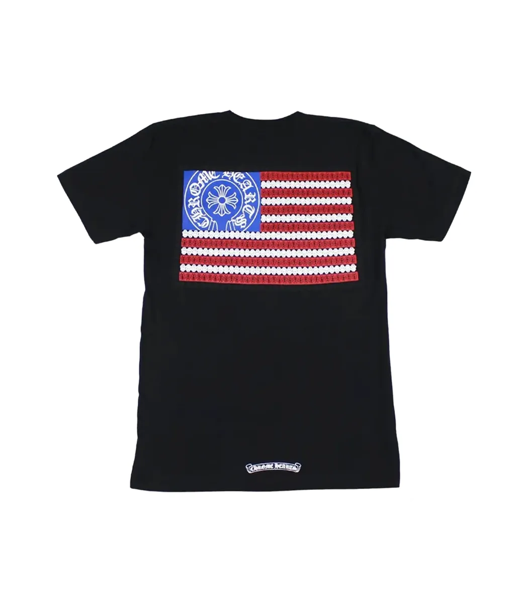 Chrome Hearts American Flag T-Shirt – A bold and stylish short-sleeve tee, featuring a striking American flag graphic with iconic Chrome Hearts branding. Made from premium fabric, this t-shirt is perfect for adding a patriotic and edgy touch to your streetwear collection!