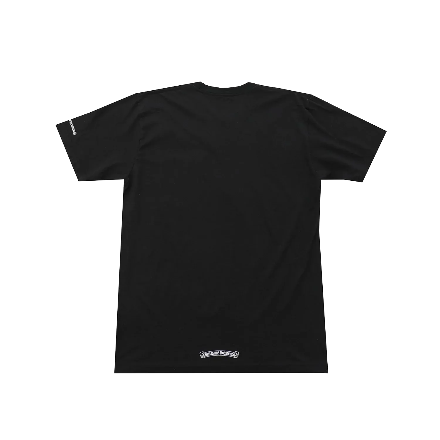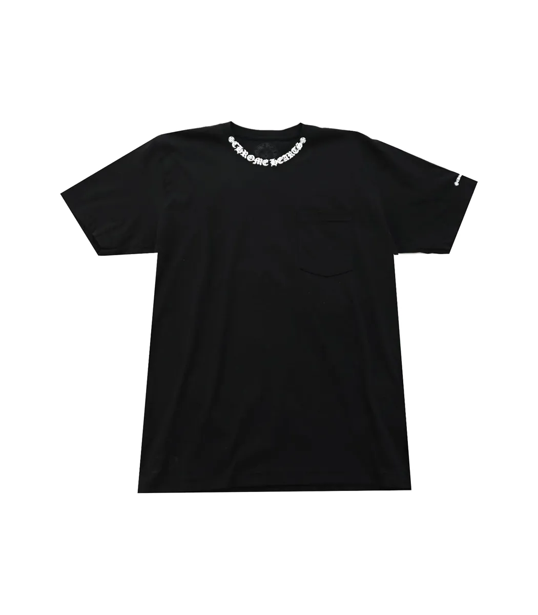 Chrome Hearts Neck Letters Short Sleeve T-Shirt – A sleek and stylish short-sleeve tee, featuring bold Chrome Hearts lettering around the neckline for a distinctive look. Crafted from premium fabric, it’s perfect for adding a subtle yet edgy touch to your streetwear collection!